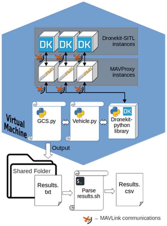 To realize the proposed solution, each UAV in the swarm will be equipped with a companion computer capable of executing lightweight Python-based scripts (v3.10.12). These computers (e.g., a Raspberry Pi) communicate with the UAV’s autopilot using the MavLink protocol. In this study, the autopilot is emulated utilizing the Dronekit-SITL environment in scenarios with up to 12 UAVs per swarm.