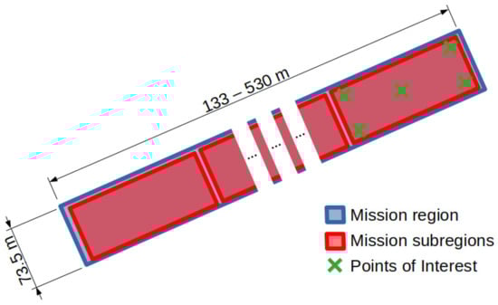 The simulations of dynamic scenarios (cf. Section 5.3) were carried out by defining new missions with area lengths ranging from 530 m to 1.02 km with increments of 44.5 m. The POIs introduced were chosen in the same way as those of the original missions, placing one in each corner and the center of the last subregion of each mission (cf. Figure 5). The maximum inspection area length is defined from the Wi-Fi 6/6E video transmission range (i.e., 200 m, which allows transmitting 17 Mbps) to ensure that there is always connectivity between neighbors through both interfaces.