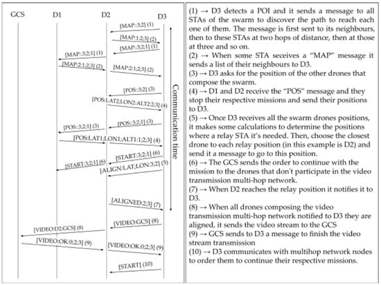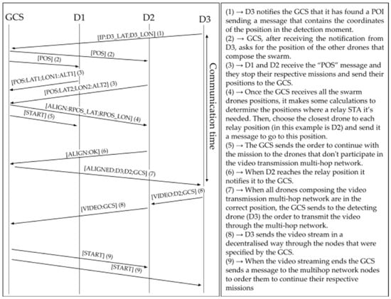 Figure 6 and Figure 7 show the message sequence when a POI is detected for centralized and decentralized architectures, respectively. In the example, upon detection of a POI by drone D3, a two-hop data path is built, including drone D2 as a relay.