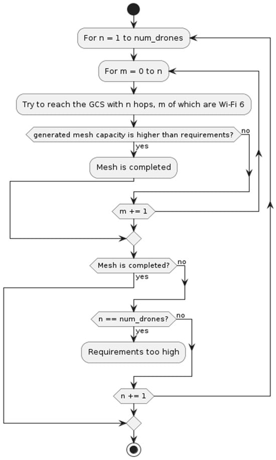 In dynamic scenarios, to resolve the multi-hop network, a brute force strategy was applied, which consisted of first testing solutions built of single-hop networks, and increasing the number of hops until a tested solution meets the requirements. This is represented in Algorithm A1 with the while loop contained between lines 6 and 21. This strategy was adopted because, before the generation of the network, it was not known how many hops it would take to reach the GCS. Therefore, the requirements to be met by the links are unknown, since the more hops, the more the bandwidth is distributed and the greater the individual link capacity needed. By defining the length of the network and the technology used in each hop, the capacity of the links is also defined. Line 9 in Algorithm A1, shows how, using the “GetLinksReq” function, the requirements for the links that compose the multi-hop network are obtained. It is then possible to start creating the network by searching for nodes that are located at a distance that allows the required throughputs to be achieved despite having to share the medium with adjacent links that use the same technology. In addition, for each number of nodes in the network, the different combinations of technologies had to be tested. So, tests were started with all links being Wi-Fi HaLow, and increased the number of Wi-Fi 6/6E links until the capacity requirements were met, unless the all-Wi-Fi6/6E link combination is still unable to fulfill the requirements. In that case, the mesh length is increased by one more hop and the process starts again (trying with all links being Wi-Fi HaLow and increasing the Wi-Fi 6/6E one by one until the requirements are met). The while loop between lines 8 and 20 of Algorithm A1, included in Appendix A, illustrates how this is implemented in the code.