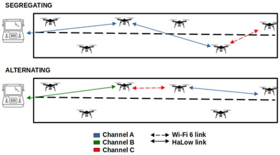 Initially, the hops of both technologies were arranged in a segregated way, i.e., first the required Wi-Fi 6/6E hops were allocated on the detecting drone side, and then all the Wi-Fi HaLow hops were allocated next so that the last one had the GCS at one end. Then, the alternating strategy was implemented, in which the technologies used for each link of the multi-hop network are ordered. In this way, different links can use distinct channels and thus avoid interference. Figure 10 shows both strategies. As can be seen, in the segregated strategy, the UAV that communicates with the GCS has to reuse the channel through which it receives, since transmission and reception are carried out through the same interface. When alternating, it can use different channels because reception is carried out through the IEEE 802.11ax interface.