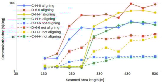 The areas scanned under both aligning and non-aligning scenarios (cf. Section 5.3) are 73.5 m wide, and the lengths range from 133 m to 530 m with intervals of 44.5 m (cf. Figure 5). Although mission areas could be longer, this set of missions is diverse enough to study the behavior of the swarm when the distances and the number of UAVs grow. Note that, using Wi-Fi HaLow as the control channel interface, centralized architectures could cover areas within a 1 km radius from the GCS (i.e., covering distances more than 2 km apart). For decentralized scenarios, however, there is no limit as long as all nodes have at least one neighbor within range.