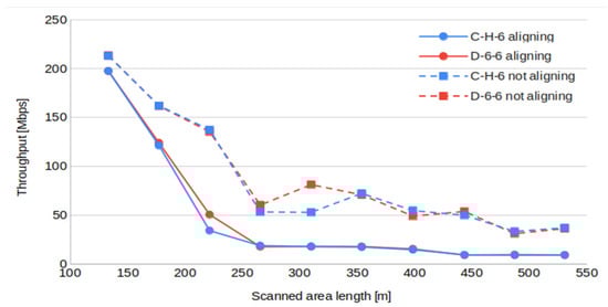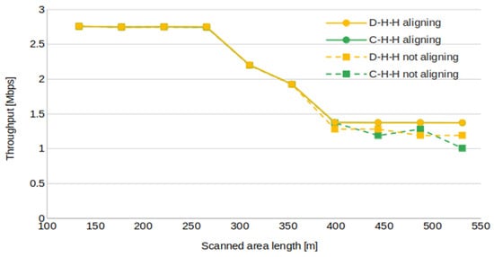 The results may seem counterintuitive, since the alignment of UAVs provides homogeneous distances, avoiding excessively long links, causing a bottleneck in the path. Note, however, that all links, except the last one, are, by design, as long as the minimum video transmission can afford, reducing the total capacity of the mesh. Without alignment, the relay positions are determined hop by hop, finding the closest node to the GCS inside the video transmission range of the last found hop. This results in a mesh composed of links whose distances are, at most, the maximum range of video transmission, but, in most cases, several tens of meters shorter. In dynamic scenarios, throughput results are primarily influenced by the capacity requirements and, therefore, do not warrant in-depth analysis.