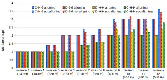 The analysis starts with a comparison of aligning and non-aligning scenarios (Figure 15). The non-aligning method focuses on reducing the time to build the mesh to transmit the video stream, but it increases the average number of hops to do it. Even so, the difference is not large.