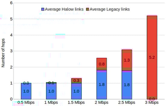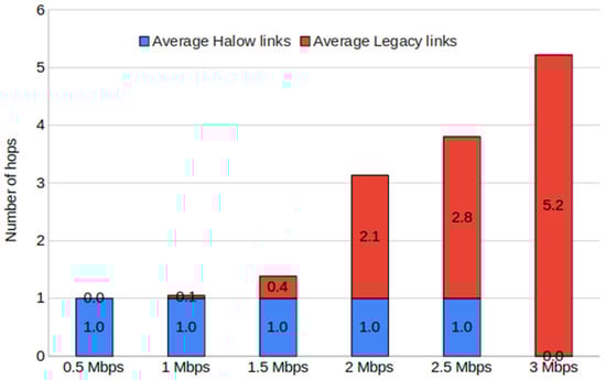 For a demand of 0.5, 1, 1.5 and 3 Mbps, no relevant difference in the number of hops is observed between alternating and segregating methods. In the former three, this is due to the fact that most distances can be covered with one or two hops. In the last one (3 Mbps), all links must be implemented with Wi-Fi 6/6E because the demand is above the maximum throughput offered by Wi-Fi HaLow. Interestingly, the cases with 2 and 2.5 Mbps requirements show significant differences and a notable increase compared with the 1.5 Mbps case. This is because increasing the minimum throughput to 2 Mbps means greatly reducing the coverage range of Wi-Fi HaLow links from 880 m to 500 m, and also due to the impossibility of chaining two consecutive Wi-Fi HaLow links, because of the resulting interference. For a demand of 2.5 Mbps, the alternating approach again shows better results, achieving the greatest advantage over the segregated approach. It is worth noting the difference in terms of the predominant technology in each case. For the segregating approach, more Wi-Fi 6/6E links are used, while in the alternating approach, Wi-Fi HaLow links predominate.