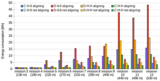 Thanks to reducing communication time, non-aligning scenarios outperform aligning scenarios in terms of power consumption (Figure 18). The average energy consumption observed in the aligning scenarios was 11.15 Wh, while the non-aligning scenarios reduced the consumption to 3 Wh. In addition, when comparing scenarios with different architectures, centralized approaches obtain better results since this architecture reduces the communication time, as discussed in Section 6.1.