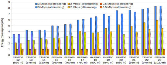 The benefits of using dynamic scenarios are a combination of improvements in communication time and a reduction in the number of hops. Alternating wireless technologies at each hop improves the energy performance compared with segregating, thanks to the fact that it reduces the number of hops for large mission areas when demanding 2 Mbps (Figure 19).