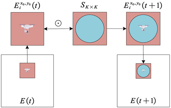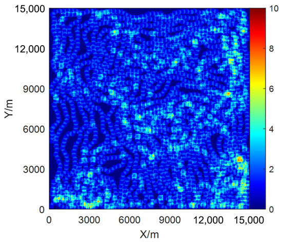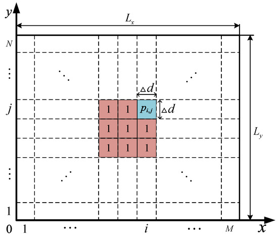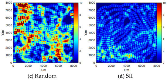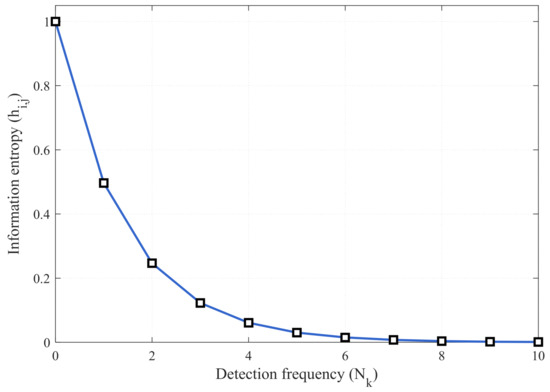- Entropy gain: Entropy reflects the uncertainty in the mission area rather than a simple coverage state [45,46,47]. The search potential field generated by the gradient characteristics of the entropy field drives UAVs to search in high-entropy areas. The corresponding entropy gain is as shown in Formula (14):