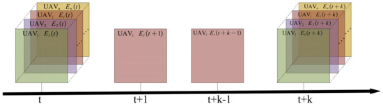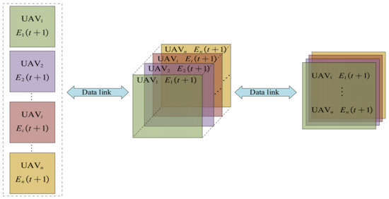 | Initialization task parameters: UAV state equation , Environmental matrix , Grid state , Entropy matrix for t = 1: for i = 1: Calculate the UAV state equation and preliminary control input according to Equation (4) and Equation (20) Calculate the environment matrix and entropy matrix according to Equation (2) and Equation (8) end for Communication network sharing and sending , . Receive , from other machine for i = 1: Update according to Equation (10) Based on calculation, the final decision is update end for Update the global if set threshold break end if end for |