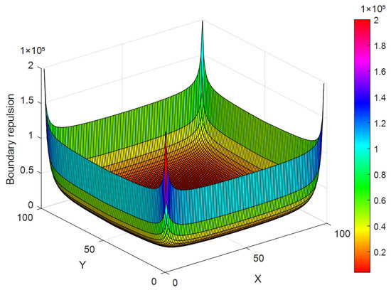- Boundary constraint: When explores near the boundary, the effective search area of the UAV will be reduced. A virtual potential field is designed to provide boundary repulsion to prevent this situation [48]. The magnitude of the boundary repulsion is inversely proportional to the distance from the UAV to the boundary; the closer the distance, the greater the repulsion, as shown in Formula (16) and Figure 8: