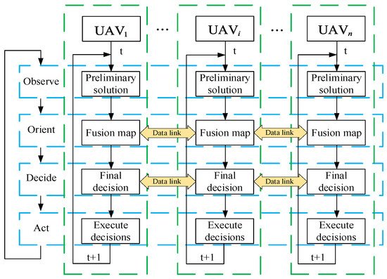 - A cooperative framework based on DMPC is combined with a receding horizon optimization model to quickly implement the Observe-Orient-Decide-Act (OODA) closed-loop mechanism. Through a dynamic prediction model, each UAV solves for the optimal heading angle based on existing environmental information, realizing local information interaction in the Observe phase, search direction plan adjustment in the Orient phase, decision selection in the Decide phase, and final action execution in the Act phase.