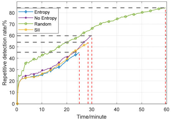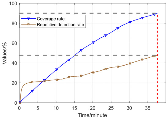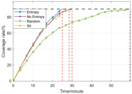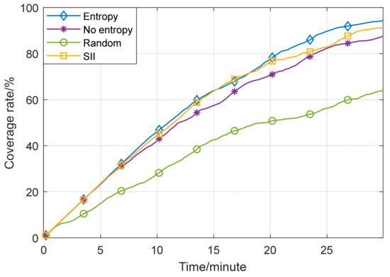 - Coverage increment: Each UAV in the cluster will prioritize the direction with the largest increment in coverage area when adjusting its flight angle, so as to complete the search task in a shorter time. The coverage rate of the mission area at the corresponding time is obtained by calculating at that time: