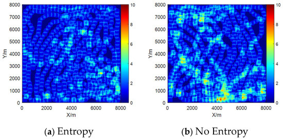 The interval distribution of the non-entropy mode and SII mode ranges from 2 to 9 times, with some grids being explored multiple times, showing a situation of “regional repeated stagnation”, which results in the inefficient allocation of exploration resources. The random mode has a wider interval range, covering 2–18 times. Unordered searching leads to excessive exploration of some grids, seriously wasting search resources and presenting the drawback of “global repeated proliferation”.