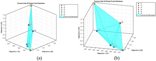The six non-dominated solutions form the Pareto front, with their three-dimensional objective function values distributed as shown in Figure 3a,b. Subfigures (a) and (b) in Figure 3 represent two views of the same subject from different observation angles. The visualization presents the convex hull boundary of the Pareto front solutions obtained through the LIA algorithm for this multi-objective optimization problem. The solution set exhibits a non-linear distribution, with dense clusters concentrated in the and intervals, indicating significant trade-off relationships between objectives. Solution r4 represents an extreme preference for optimizing (minimizing total path length), while solution r5 demonstrates an extreme preference for optimizing (minimizing the longest sub-path length). The blue-marked convex hull boundary displays strict convexity, verifying the conflicting nature of the objective functions. The changing slope of the boundary reveals that, for every 1-unit improvement in , requires a sacrifice of 0.02–0.05 units, with the marginal rate of substitution varying dynamically according to the solution positions. Frontier analysis identifies distinct ‘knee point’ solutions r1 and r6, where abrupt changes in the marginal rate of substitution occur before and after these points, serving as critical boundaries for decision-makers when evaluating preference trade-offs. The visualization intuitively demonstrates the fundamental contradictions inherent in multi-objective optimization, providing a quantitative foundation for the selection of Pareto-optimal solutions.