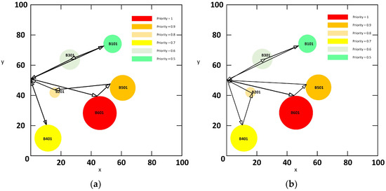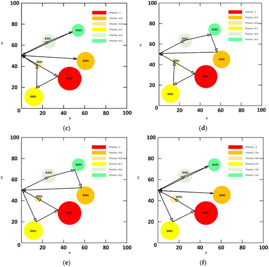 The task allocation and path planning diagrams corresponding to the Pareto solution set are illustrated in Figure 4. Specifically, sub-figures (a), (b), (c), (d), (e), and (f) demonstrate solutions that prioritize engaging the high-priority objective B601, as evidenced by their corresponding lower priority scores (time sensitivity index).