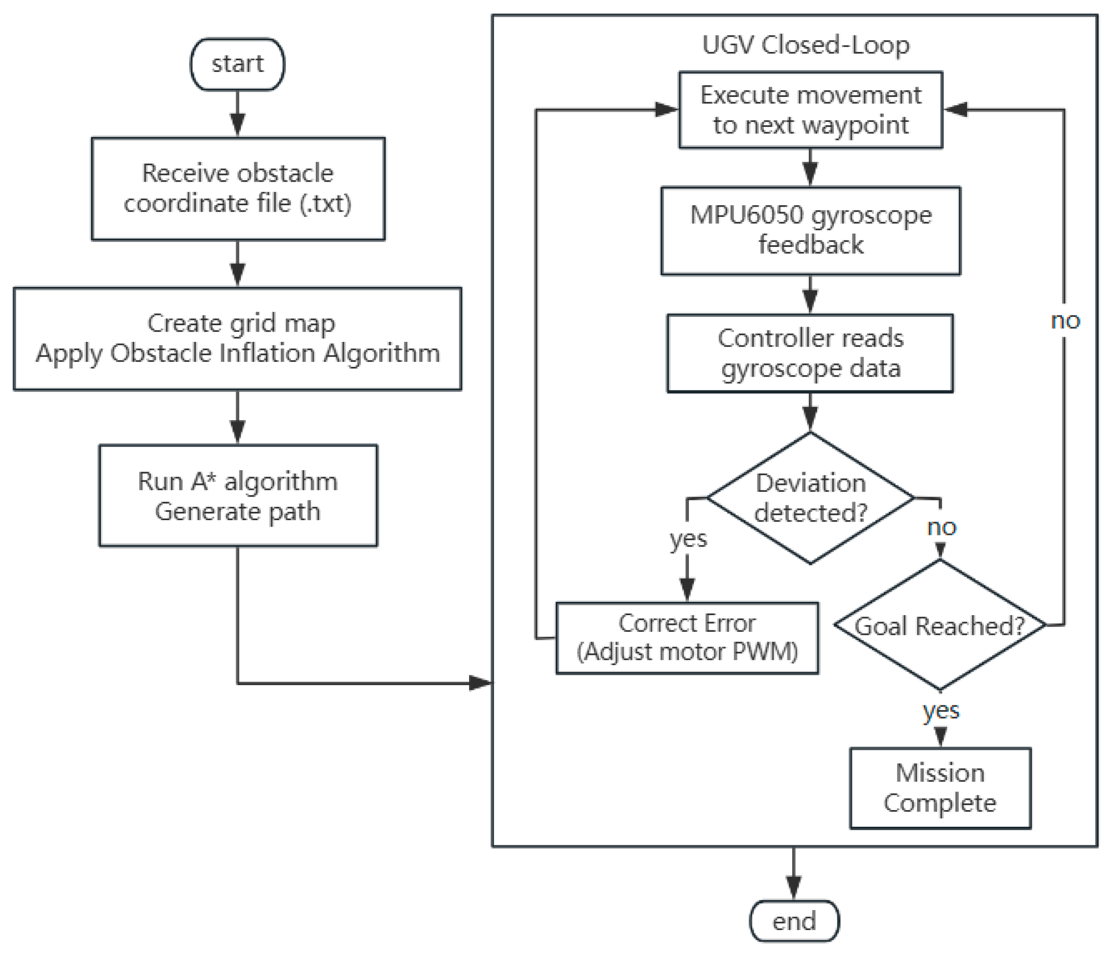 Input: obstacle_coords(from Algorithm 1), start_point,goal_point. Output: Completed physical navigation of the UGV along a collision-free path. 1: procedure UGV_Navigation_Process(obstacle_coords, start_point, goal_point); 2: navigable_map ← Create_Map_And_Inflate_Obstacles(obstacle_coords); //Step 1: Map Generation and Preparation for Safe Navigation. //Create a grid map from the obstacle coordinates and apply the obstacle inflation algorithm. 3: optimal_path ← Find_Path_A_Star(navigable_map, start_point, goal_point); //Step 2: Optimal Path Planning //Run the A* algorithm on the inflated (safe) map to find the most efficient path. 4: //Based on the A cost function defined in Equations (7) and (8). 5: if optimal_path is found: //Step 3: Physical Path Execution 6: Follow_Path_With_Gyro_Feedback(optimal_path); 7: //Implements motion control loops using Equations (9)–(12). 8: end procedure; |