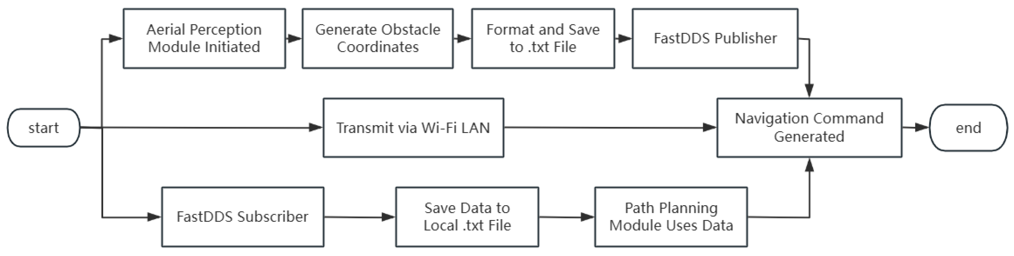 Input: map_data, mission_goal. Output: The successful transmission of the map data from the UAV to the UGV, triggering the start of the UGV’s autonomous navigation task. //On the UAV (Publisher) Side. 1: procedure Publish_Map_Data(map_data); //The UAV acts as the “Publisher” in the Fast DDS framework. To a specific topic named “MAP_DATA”. 2: Publish(topic: “MAP_DATA”, data: map_data); 3: end procedure; //On the UGV (Subscriber) Side. 4: procedure Receive_And_Trigge-r_Navigation();//The UGV acts as the “Subscriber,” continuously listening to the “MAP_DATA” topic. 5: map_data ← Subscribe_And_Wait_For_Data(topic: “MAP_DATA”); 6: Execute_Ground_Navigation(map_data);//Initiates the process detailed in Algorithm 2 //As soon as the map data is received, it triggers the ground navigation process. //The received “map_data” becomes the direct input for the UGV’s path planner. 7: end procedure |