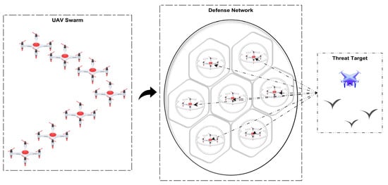 Conventional defense models including geometry-based or heuristic rule-based approaches exhibit critical limitations in their effectiveness against emergent threats. These deficiencies stem from static environmental assumptions, discrete decision intervals, and inadequate responsiveness to subsecond-scale maneuvering dynamics [5]. While optimization-based formulations provide theoretical rigor via mathematical programming of cooperative deployments, they confront three fundamental limitations: (1) high-dimensional nonlinearity arising from spatial-coordination dependencies, inducing escalations in computational complexity [6]; (2) real-time feasibility constraints requiring tractable solutions within stringent operational timeframes [7]; (3) dynamic collision constraints mandating concurrent optimization of spatial coverage and intra-swarm safety assurance [8]. In the field of defense against low-altitude drone intrusion, multiple interception strategies have been proposed to optimize regional protection efficacy. Conventional single-drone interception mechanisms (e.g., the pure pursuit guidance algorithm described in [9] and the net interception technique described in [10]) demonstrate precise strike capability against point targets, yet their limited defensive coverage and inefficacy against saturation attacks remain challenges. To enhance interception coverage, collaborative interception paradigms have been progressively developed: Ref. [11] established a red–blue confrontation-simulation model based on multi agent reinforcement learning, achieving multitarget cooperative interception through centralized task allocation, though its assumption of a static environment compromises dynamic adaptability. Ref. [12] improved task-allocation efficiency via a game-theoretic target–defender optimization model, but the computational complexity induced by high-dimensional state spaces impedes real-time performance. Consequently, investigating the formation of drone-swarm-based collaborative defense networks/barriers in dynamic real-time environments may enable efficient interception of single or multiple targets.