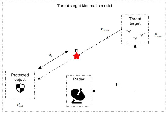 The position of the target at time t after its initial detection is denoted by the vector . The constant speed of the target is denoted as , and its direction of motion is determined by the vector from to . Here, represents the target’s position at the time of initial detection, and denotes the position of the protected asset (located at the origin).