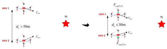 where denotes the maximum effective sensing radius (repulsion activates only when ). As shown in Figure 3, the repulsive force vector exerted on UAV i by UAV j is oriented away from the position of UAV j, and governs the repulsion intensity with superlinear growth as distance decreases.