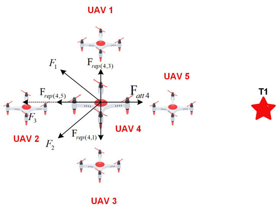 As illustrated in Figure 4, UAV 4 experiences repulsive forces from UAV 1, UAV 2, UAV 3, and UAV 5, while simultaneously being subjected to an attractive force from target . In the figure, denotes the resultant repulsive-force vector exerted on UAV 4 by UAV 1 and UAV 2; denotes the resultant repulsive-force vector exerted on UAV 4 by UAV 3 and UAV 5; represents the total resultant repulsive-force vector acting on UAV 4 (i.e., the vector sum of repulsive forces from all surrounding UAVs); denotes the attractive-force vector exerted on UAV 4 by target . In this depicted scenario, the magnitude of may exceed the magnitude of , and, crucially, the direction of the net force may point away from the target. This condition can prevent the UAV from reaching target .