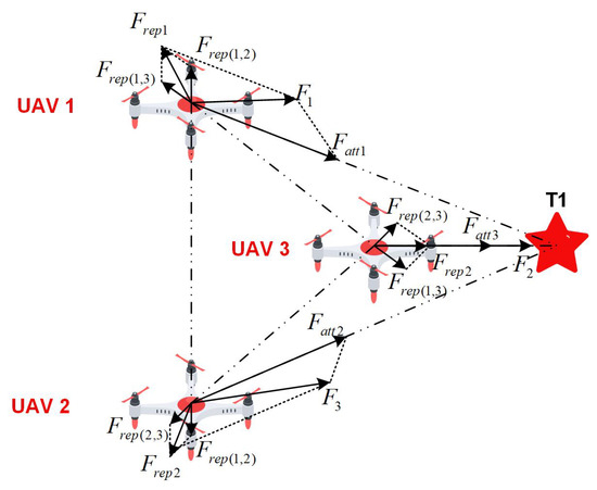 Figure 5 illustrates the force-analysis diagram of UAV swarms, where the resultant force acting on each UAV is depicted with directional arrows, explicitly visualizing the dynamic coupling between attractive and repulsive potentials.
