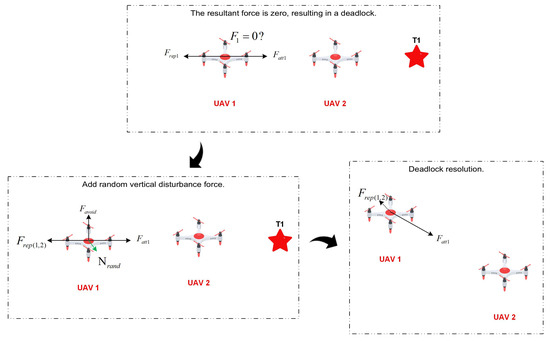 - Symmetric deadlock: While navigating towards the target, the UAV is subjected to an attractive force from the target and repulsive forces from obstacles or other threats. The UAV reaches an equilibrium state when the net force (vector sum) acting on it equals zero.