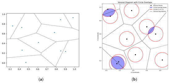 (a) Each point represents a drone’s position, with the surrounding polygon defining its Voronoi cell. (b) In drone swarms, coverage areas may extend beyond Voronoi boundaries, creating overlapping regions.