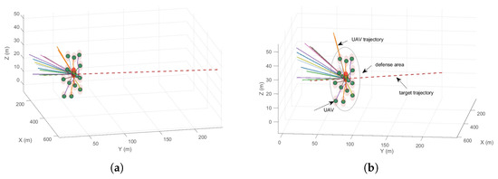 From the trajectory visualization, we observe that during the initial phase, all UAVs consistently navigate toward the common target . Upon the first UAV reaching the interception plane, subsequent optimization activates, prompting the UAVs to strategically disperse around the collision point. This dispersion forms an optimized planar defense network, significantly expanding the protected area while ensuring interception effectiveness. The pink shaded regions represent the effective coverage radius of individual UAVs, illustrating their spheres of influence within the collective defense system. When the system scales to 15 UAVs, as shown in Figure 9a,b, we conduct detailed analysis of swarm dynamics, as follows: