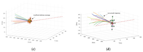 (a) Spatially distributed interception network formed by 15 autonomous UAVs via the hybrid APF−PSO algorithm. (b) Side view of the defense network, including the flight route of the unmanned aerial vehicle. (c) Spatially distributed interception network formed by 15 autonomous UAVs via the hybrid APF algorithm. (d) Spatially distributed interception network formed by 15 autonomous UAVs via the hybrid IPSO (Improved PSO) algorithm.