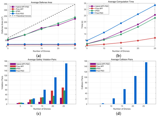 To ensure experimental rigor, we conducted the following tests: for each scenario with 5, 10, 15, 20, and 25 UAVs respectively, we performed 50 independent experimental trials in Table 1 and Figure 10. We quantitatively evaluated the following key performance metrics. (1) Average defense area. (2) Average computation time (the computation time refers to the actual CPU time consumed by the algorithm from initialization to completion of the entire simulation process, which depends on CPU performance and reflects the computational efficiency of the algorithm. This metric enables horizontal performance comparison between different algorithms but does not represent the actual physical operation time in the real world. In this experiment, each iteration of the algorithm is defined to last 0.1s (dt = 0.1 s). All timing measurements were conducted using an AMD R7-4700U processor (Advanced Micro Devices, Inc., Santa Clara, CA, USA; 2.00 GHz base clock) with MATLAB R2022a’s tic-toc timing framework to ensure consistency across trials). (3) Average number of safety violations. (4) Average number of collisions.