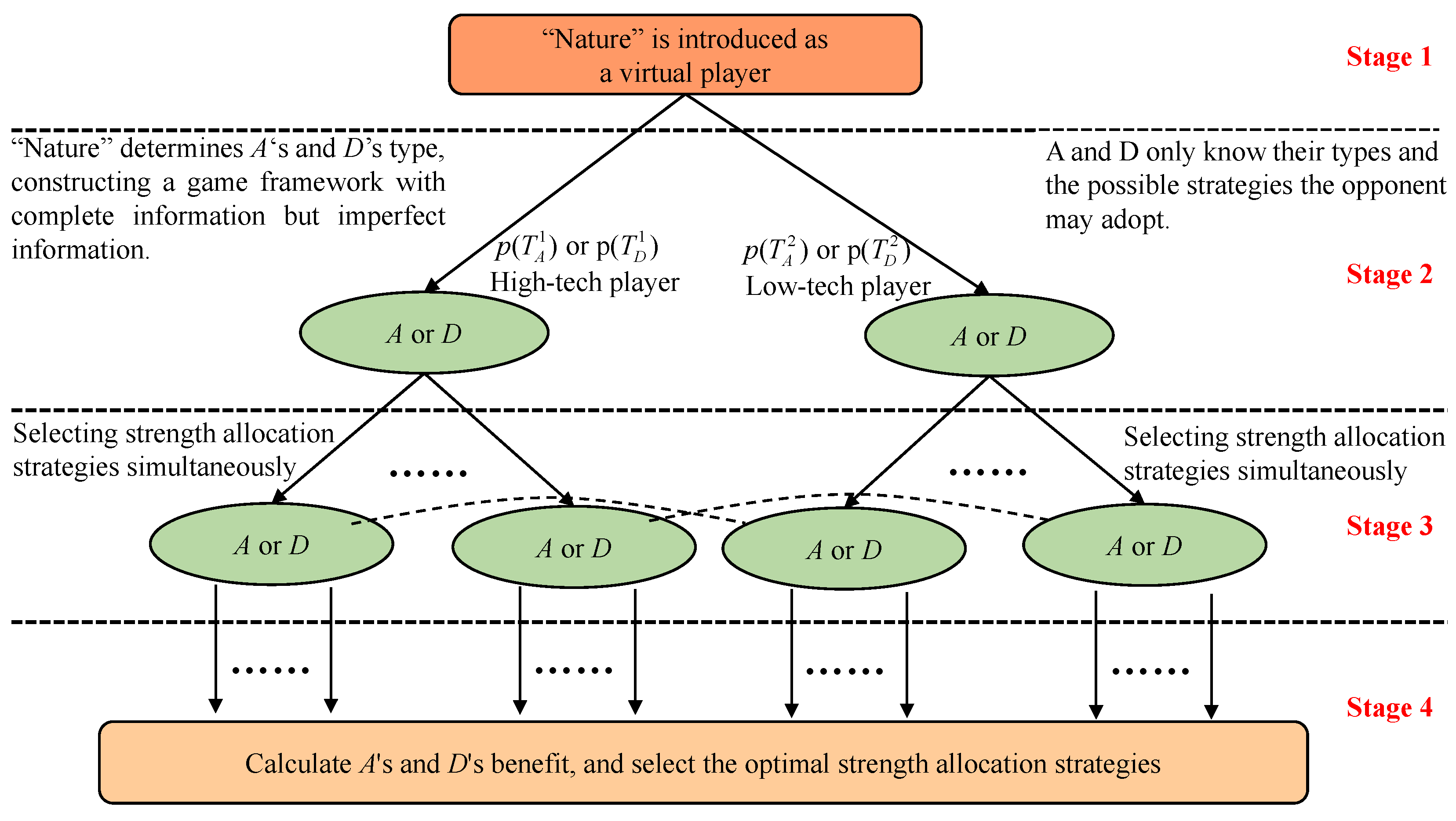 - represents the set of players’ types, including =, , …, for A and =, , …, for D.