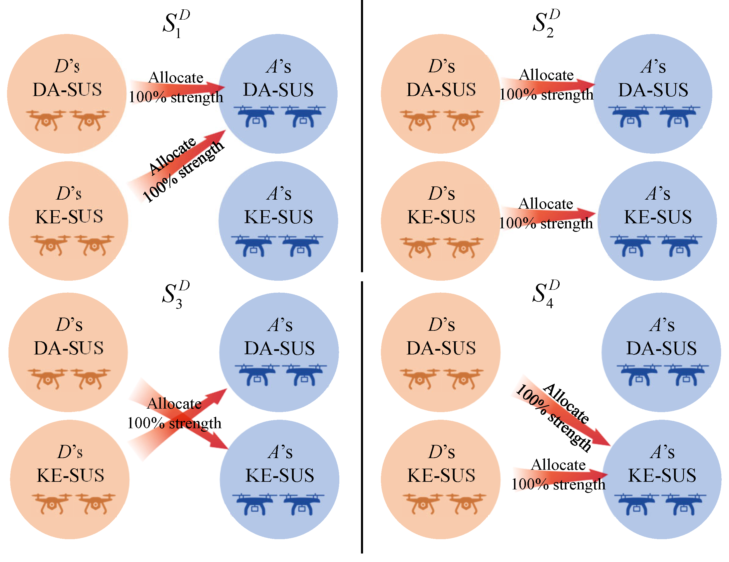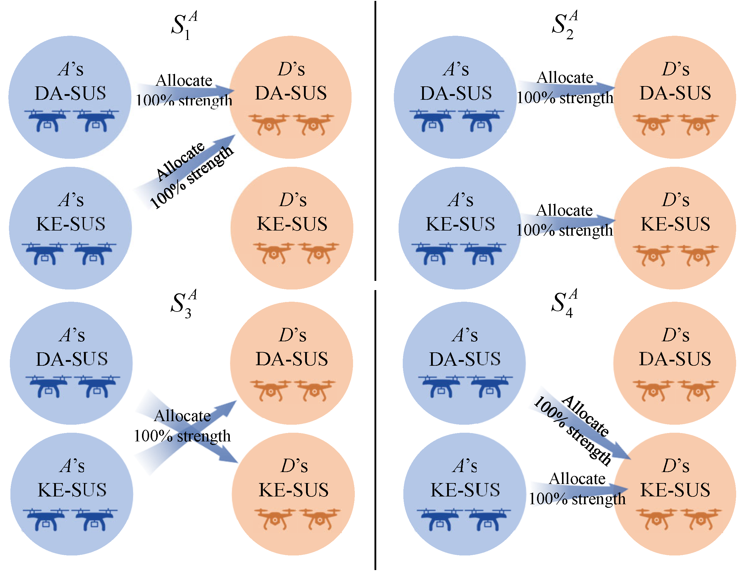 - represents the set of strategies, with =, , …, as A’s strength allocation strategies and =, , …, as D’s strength allocation strategies.