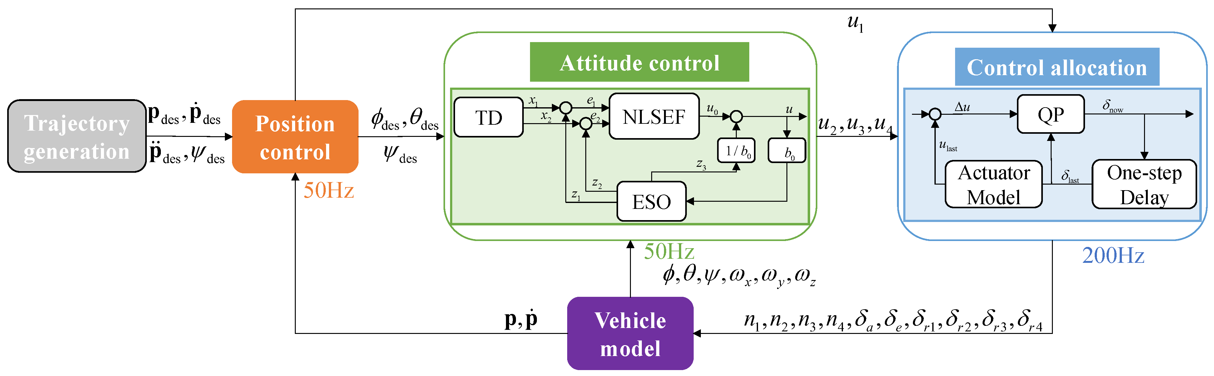 - An optimization-based control allocation framework is employed to address the control allocation challenges associated with implementing a blown yaw. The proposed framework not only accurately maps the required control forces and torques to the actuators but also accounts for the actual physical model of the actuators and their varying execution efficiencies. This module is integrated into a comprehensive control system, including a cascaded PID position controller and an Active Disturbance Rejection Control (ADRC) attitude controller, to track the specified trajectory.