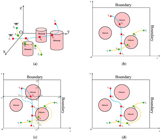 In Figure 1, two UAVs ( and ) depart from their respective starting points and , follow planned trajectories toward the target destinations and , and may encounter a collision during their flight. To ensure flight safety in a shared airspace, a collision avoidance mechanism must be introduced.