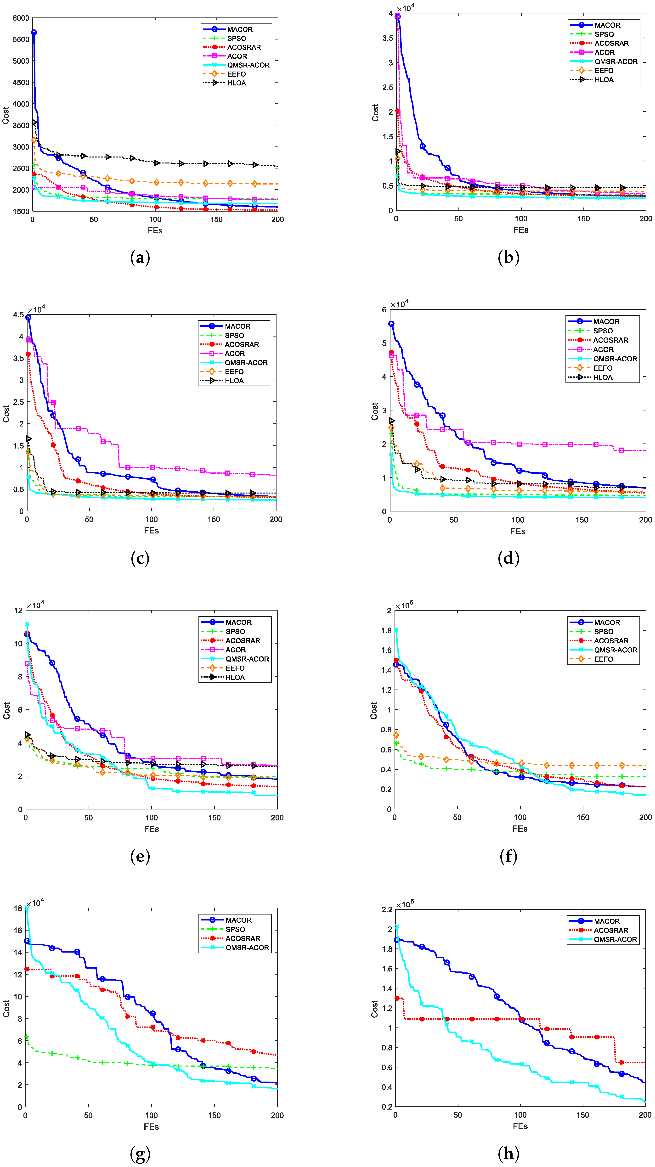 Figure A1, in the 10D path planning problem, the convergence curves from Case 1 to Case 8 show that QMSR-ACO