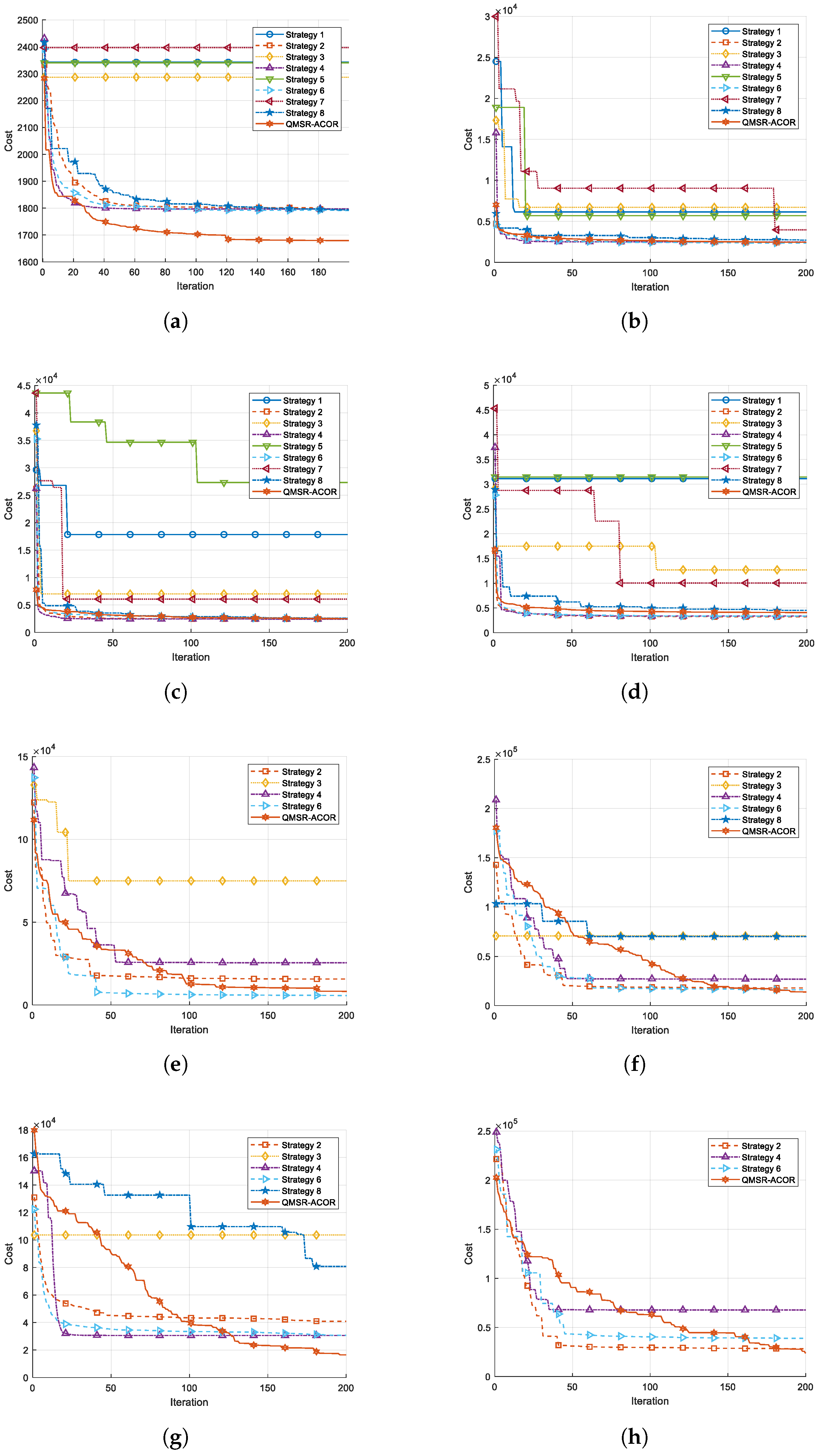In general, the combination of ADGSC or EGMC with Gaussian mutation (Strategies 2 and 4) delivered the best performance in terms of both convergence speed and solution quality. Furthermore, QMSR-ACOR achieved the lowest path cost in most cases, maintaining high robustness even under complex conditions (e.g., Cases 6–8). Its Q-learning mechanism enables dynamic selection of constructor–walk combinations based on current search states, balancing exploration and exploitation. This adaptability helps prevent premature convergence and improves overall path planning performance.