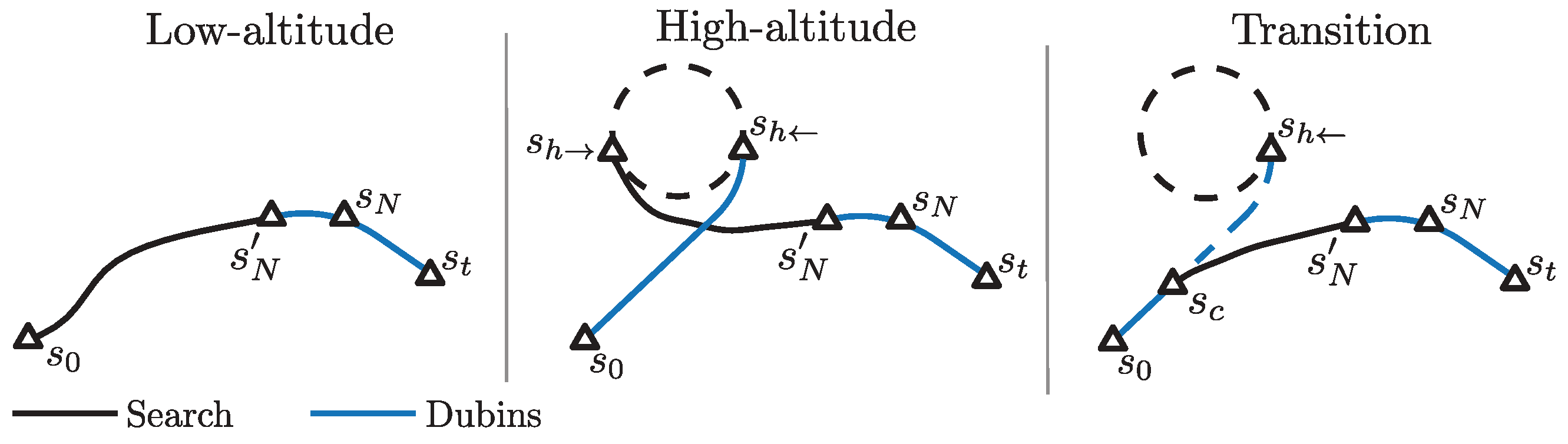 - First, must fall within a defined annulus, per Equation (57).This annulus, centered on , is independent of altitude. Ensuring that the outer diameter is at least the length of one discrete search segment, ℓ, guarantees state expansion within the outer circle. The inner radius ensures the feasibility of a Dubins path connecting the search solution to the final approach.