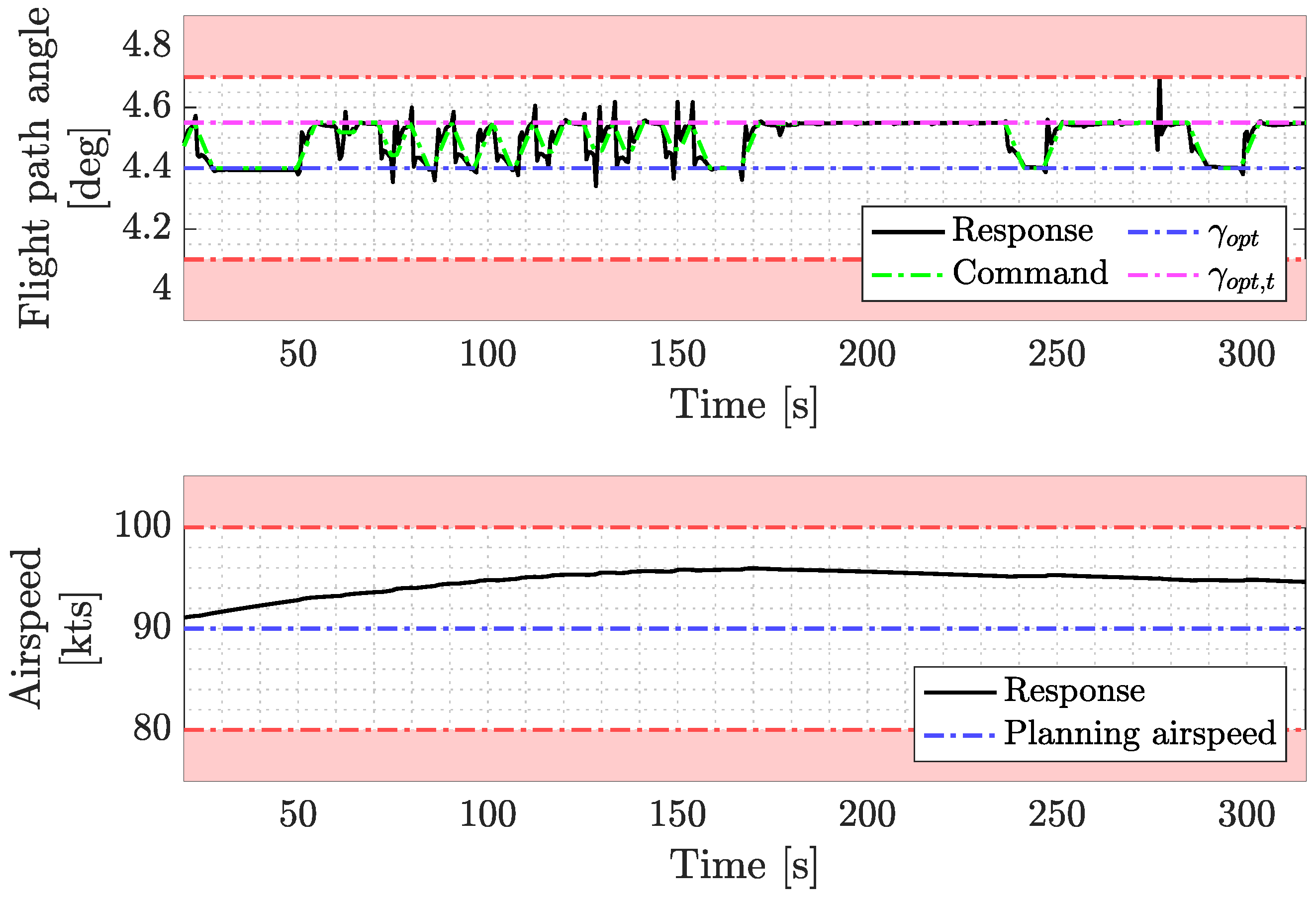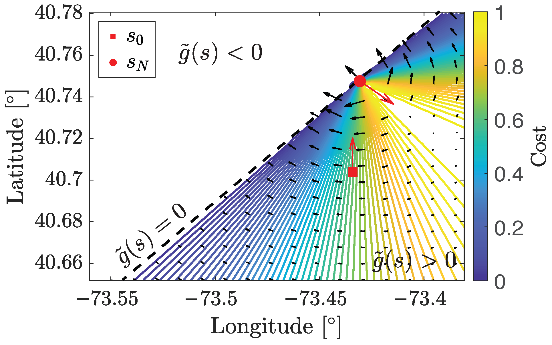 - Second, the flight path angle of the remaining traversal from to should adhere to the constraints specified in Equation (58).This constraint introduces altitude bounds to .