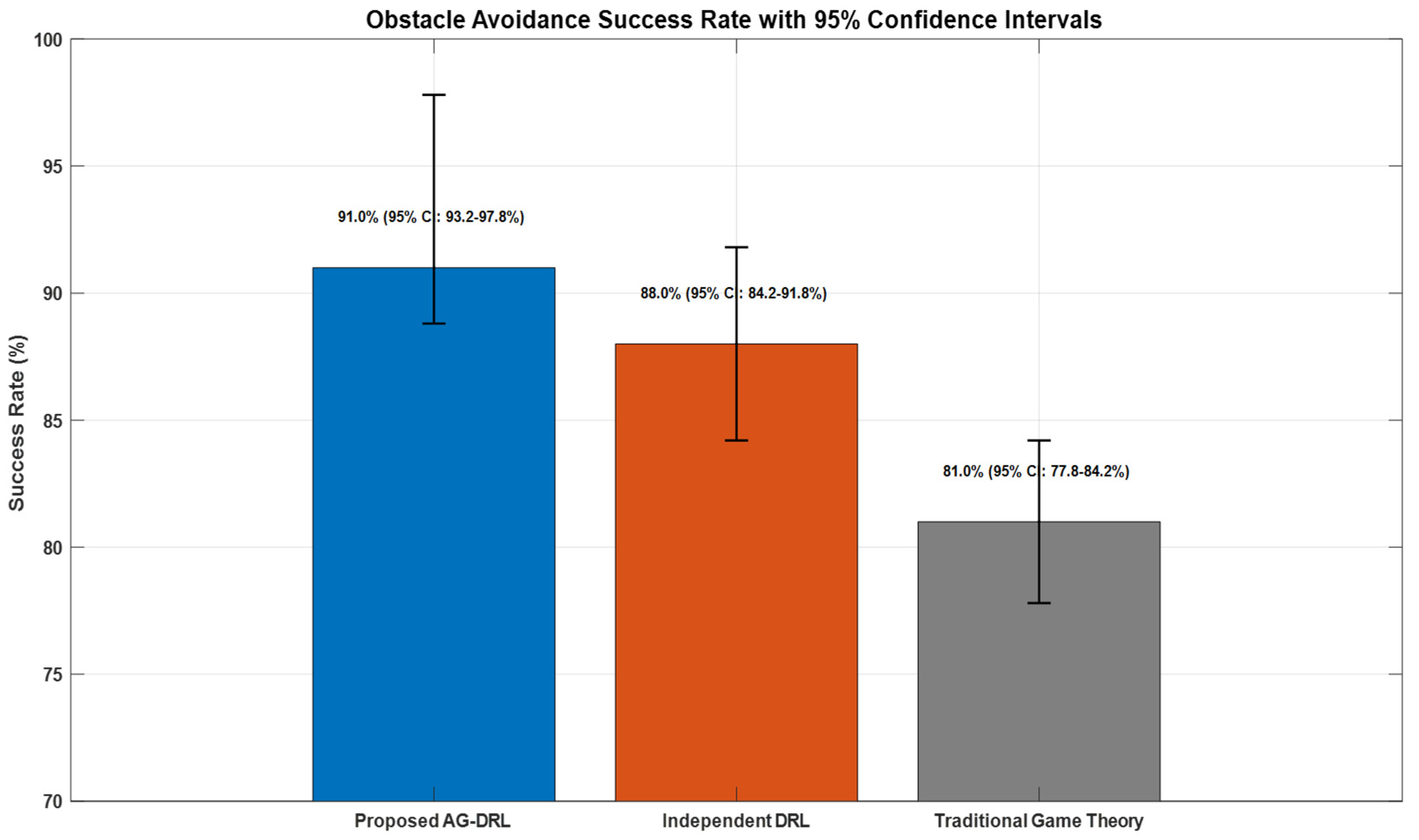 - A Multi-Scale Attention-Based Policy Network: We design a hybrid spatial–temporal attention mechanism to enhance environmental perception. This model achieves an obstacle detection accuracy of 95.1% and reduces the response time to dynamic threats to under 0.3 s.
