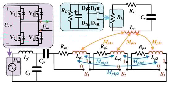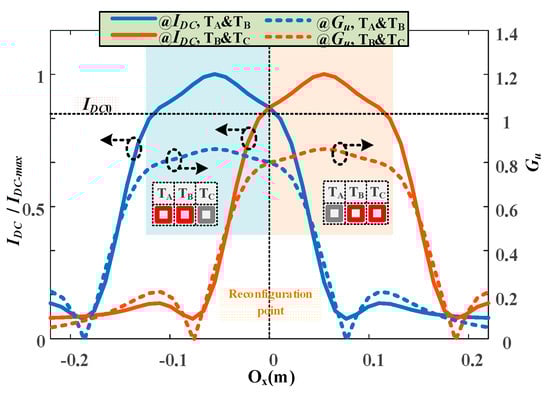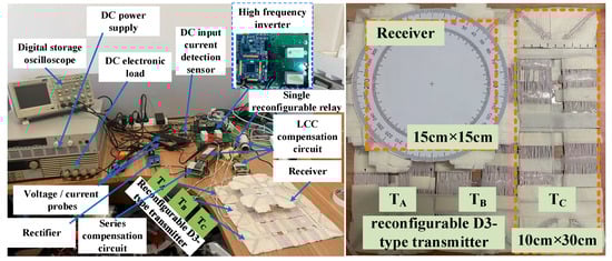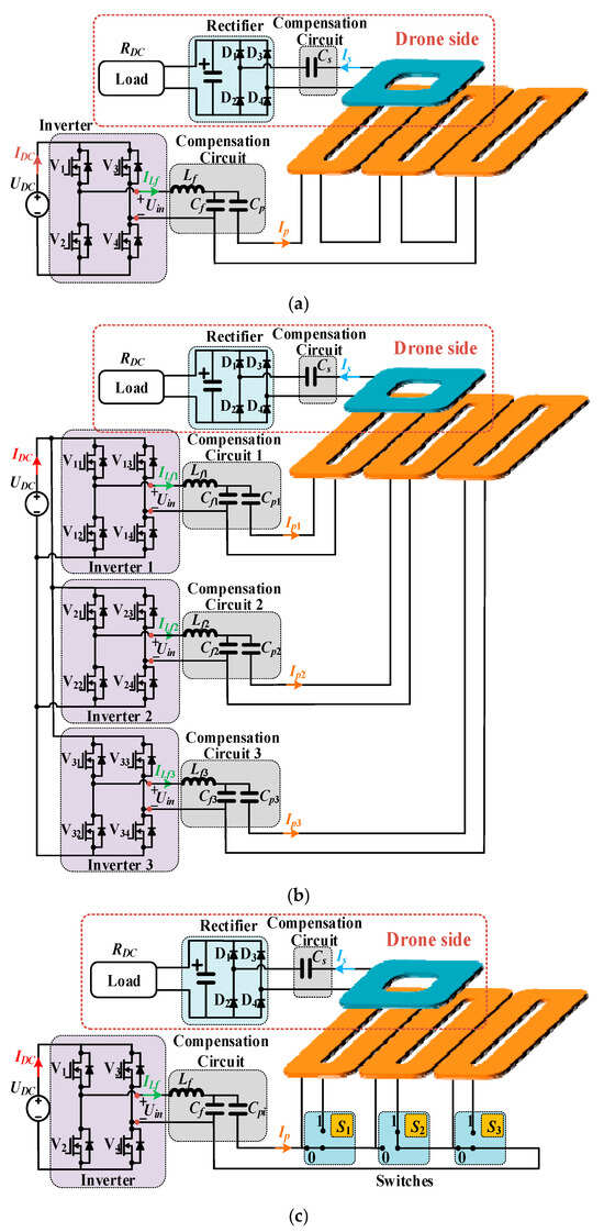 Wireless charging for drones is significant for solving problems such as the frequent manual plugging and unplugging of cables. A large number of densely packed transmitting coils and fully independent on-off control can precisely track the receiver with random access location. To balance the excitation area of the transmitter, additional hardware cost, and receiving voltage fluctuation, the wireless charging system of drones based on a D3-type transmitter is proposed in this article. The circuit model considering states of multiple switches is developed for three excitation modes. The dual-coil excitation mode is selected after comparative analysis. The transmitter reconfiguration method with low hardware cost and high receiving-excitation area ratio is proposed based on one detection sensor of DC current and one relay furtherly. Finally, an experimental prototype is built to verify the theoretical analysis and proposed method. When the output voltage fluctuation is limited to ±10%, the ratios of the maximum misalignment value in the x-axis and y-axis directions to the side length of the receiver reach 66.7% and 46.7%, respectively. The receiving-excitation area ratio of 37.5% is achieved, significantly reducing the excitation area not covered by the receiver. The maximum receiving power is 289.44 W, while the DC-DC efficiency exceeds 87.05%. Full article