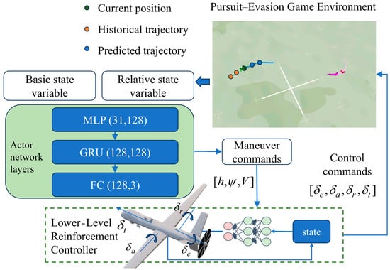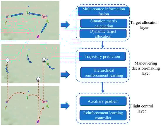 The unmanned aerial vehicle (UAV) pursuit–evasion game is the fundamental framework for promoting autonomous decision-making and collaborative control of multi-UAV systems. Faced with the limitations of current deep reinforcement learning methods in terms of transferability and generalization for scalable multi-fixed-wing UAV pursuit–evasion game scenarios, this paper proposes a hierarchical collaborative pursuit–evasion game framework based on target allocation and hierarchical reinforcement learning. The framework comprises three layers: target allocation layer, maneuver decision-making layer, and flight control layer. The target allocation layer employs a dynamic target assignment method based on a dynamic value adjustment mechanism, decomposing the multi-vs.-multi pursuit–evasion game into several one-vs.-one confrontations. The maneuver decision-making layer utilizes a maneuver decision-making method based on trajectory prediction and hierarchical reinforcement learning to generate adversarial maneuver commands. The flight control layer adopts a stable gradient-assisted reinforcement learning flight controller to ensure stable UAV flight. Comparisons with other algorithms across 3V3, 6V6, 9V9, and 12V12 scenarios demonstrate that the proposed method achieves high win rates in diverse game scales. The comparison results also demonstrate the advantages of the framework proposed in this paper in terms of training efficiency and large-scale scalability. Full article