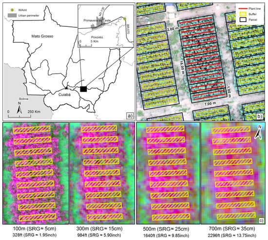(a) Experimental test site of the IMAmt, (b) parcel structure with inner buffer, and (c) plant lines in a SL camera true-color image and multispectral RGB-composites with inner buffers used for signature extraction as obtained from four flight heights with the value of spatial resolutions at ground (SRG) of each image.