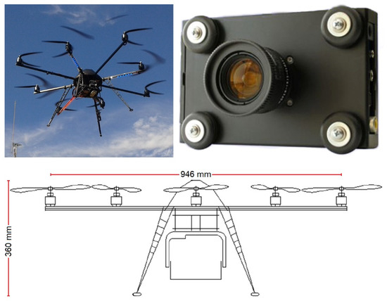 The UAV system we used was composed of a vertical takeoff and landing, eight-rotor oktokopter (model MK Okto XL 6S12, HiSystems GmbH, Moormerland, Germany) and a lightweight (200 g), multispectral TetraCam ADC camera (Tetracam Inc., Gainesville, FL, USA) with a 3.2-megapixel CMOS sensor (2048 × 1536 pixels) and 8.0 mm focal lens (Figure 2). The MK Okto platform included an ARM processor equipped with a mainboard and a navigation mainboard (NaviCtrl) with compass and GPS modules.