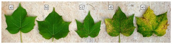 Classification key for the ramularia blight infection severity of cotton leaves. For comparison with unmanned airborne vehicle (UAV) imagery, individual plant classification was averaged, rounded by parcel, and labeled with the same key. (a) 0: without symptom; (b) 1: ≤5% of the leaf area infected, without incidences in the middle layer; (c) 2: 5–25% of the leaf area infected, incidences in the middle layer; (d) 3: 25–50% of the leaf area infected, incidences in the upper layer; and (e) 4: >50% of the leaf area infected, incidences in the upper layer, leaf loss.