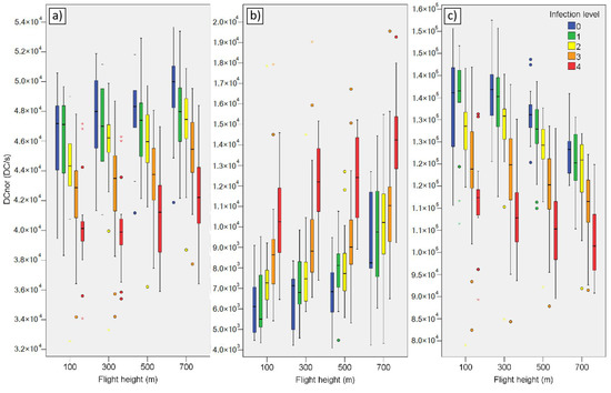 On average, the parcels of all infection levels showed a vegetation signal with expressive NIR values and higher values in the GREEN than RED band. The DCnor values of the cotton parcels with lower yields [2] and the canopies infected with verticillium wilt [7] decreased in the GREEN and NIR bands with an increased infection level (Figure 4) and increased in the RED, which corresponded to a reduction of the “red edge” in the plant leaf reflectance [53]. In general, these characteristics were maintained at all flight heights. Absolute values within the classes had the same trends at different flight heights and dispersion levels were observed for the entire dataset (Table 2), with values increasing slightly in the visible wavelength range, decreasing in the NIR, and decreasing variance with increasing flight height.