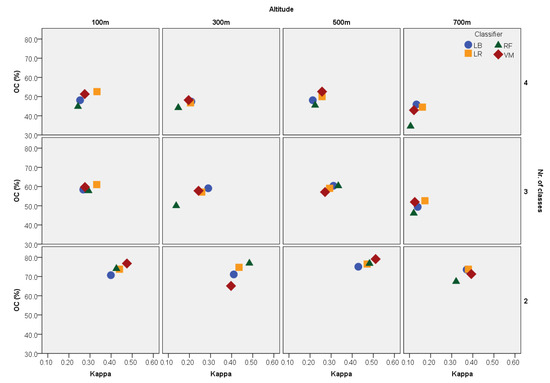 The overall classification accuracies range between ~30 % and 79 % and kappa indices between 0.02 and 0.51, respectively. As expected, the successive reduction from four to three and then to two classes improved both the accuracy measures independent of classifier and imaging height. The classifiers performed similarly, on average through flight altitudes and number of differentiated infection levels, with a slight advantage of the LR, an inductive linear approach that is known to be less sensitive to smaller amounts of training data. The RF, a machine learning ensemble classifier approach, which tends to overfitting, underperformed in the classifications with four infection levels and for the 300 m and 700 m flight heights of the three-level classification key. In the two-class aggregations, the three classifiers with higher demand for training data (LB, RF, VM) performed at least as well as LR. The best single classification performance was obtained for VM, classifying the 500 m flight height imagery in two infection levels.
