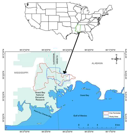 Located in southeast Mississippi and southwest Alabama, the Grand Bay National Estuarine Research Reserve/National Wildlife Refuge (GBNERR/NWR) is a 7400 ha site that is one of the 29 coastal sites designated to protect and study estuarine systems in the USA (Figure 1). GBNERR/NWR includes a variety of estuarine and upland habitats that form a mostly intact coastal watershed (Figure 1). Primary estuarine habitats include open water, submerged aquatic vegetation, vegetated salt marshes, and non-vegetated salt flats. Upland areas include wet pine savannah, coastal bay head and cypress swamps, freshwater marshes, and maritime forests. Many of these habitats depend on the regular occurrence of fire, which is critical for maintaining a highly diverse community of plants and animals. However, in the past few decades, fire suppression has led to habitat degradation and the accumulation of woody fuels, predisposing some areas to wildfire []. The details of the species located in GBNERR/NWR can be found in [].