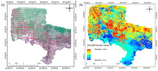 A mosaic of (a) five-band multispectral imagery of the study area (red, green and blue bands are shown), and (b) unmanned aerial system (UAS)-derived digital surface model (DSM) elevation values captured over Grand Bay National Estuarine Research Reserve/National Wildlife Refuge using a Micasense RedEdge sensor on an Altavian Nova UAS platform in February 2016. The ground reference collected area is shown as a red boundary.