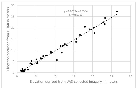 The UAS-derived DSM was used to calculate the area and volume of the burned vegetation. To check the accuracy of the UAS-derived DSM, the DSM elevation data were compared with first-return LiDAR elevation data [,]. A Leica ALS70 500 kHz multiple pulses in-air sensor was used to collect LiDAR data from a human-crewed aircraft. The Leica sensor collected up to four returns per pulse as well as intensity data. The airborne LiDAR data were collected and processed to meet a maximum nominal post spacing of 0.7 m. LiDAR data collection flights occurred March 6 2015 at an altitude of 1981 m AGL with an average ground speed of approximately 280 km/hr. The mean vertical error of the LiDAR dataset was 0.061 m with a standard deviation of 0.060 m. Geographic features that would not have changed (e.g., roads, buildings, individual trees) between data collection periods were used as points (44 points used) for comparing the elevation values produced by the DSM and LiDAR datasets (Figure 3). The validation analysis shows that the UAS-derived DSM can be a good proxy for LiDAR-derived DSM, with the regression coefficient of determination R2 of 0.97 (p < 0.0001) and the root mean squared error between the LiDAR observed and UAS-derived DSM elevations being 1.29 m.